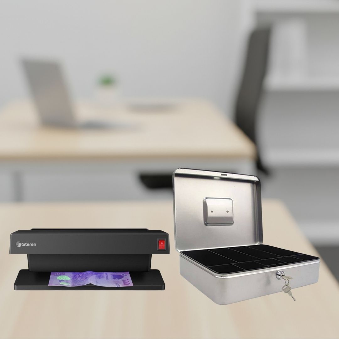 El Bundle Seguridad de Caja combina dos herramientas esenciales para la administración segura de efectivo. Incluye una caja metálica mediana para dinero, resistente y práctica, ideal para negocios, oficinas o eventos; junto con una lámpara portátil detectora de billetes falsos, que permite verificar la autenticidad de los billetes de forma rápida y confiable. Un kit completo para mantener tu dinero seguro y organizado.