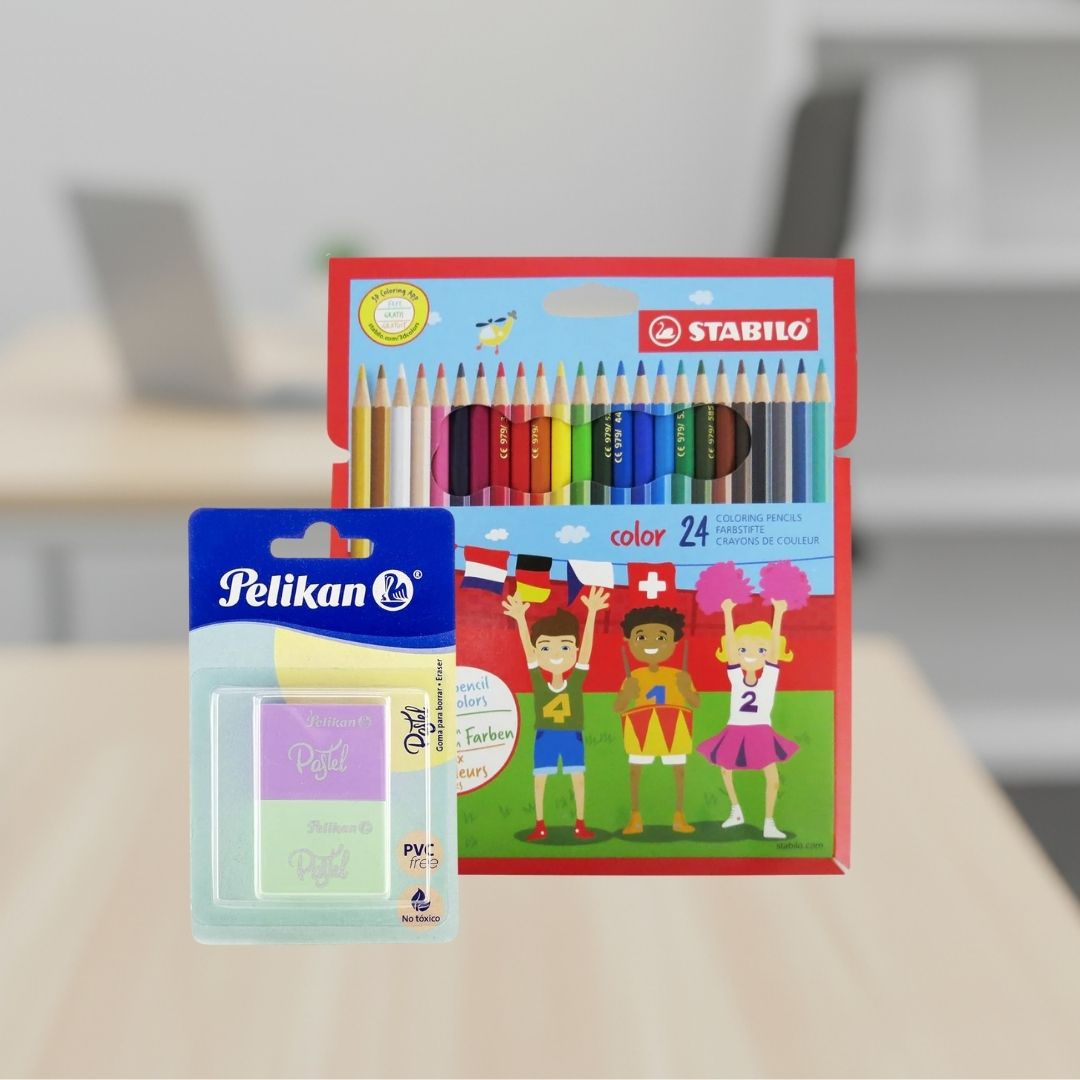 El Bundle Set Colores & Goma Pastel combina la suavidad de los lápices de colores Stabilo con la practicidad y estilo de la goma Pelikan en tonos pastel. Es perfecto para estudiantes, artistas y amantes del dibujo que buscan materiales de calidad con un toque de color y diseño moderno.