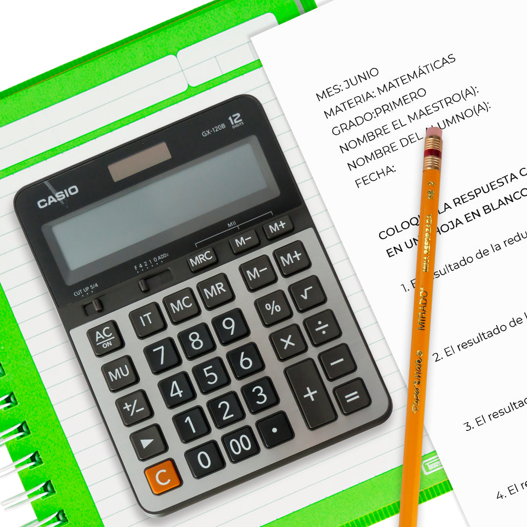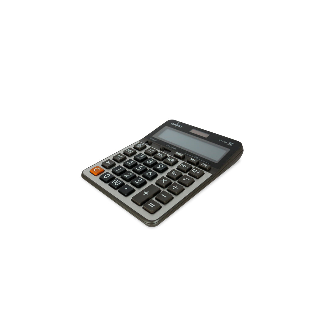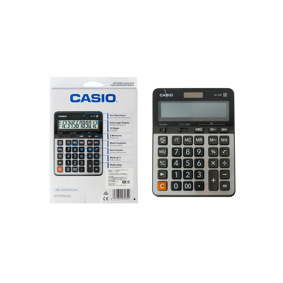 Calculadora de escritorio CASIO GX-120 de 12 dígitos con teclas de plástico. Su pantalla es extra larga para que no pierdas de vista ningún número y puede cargarse con pilas o energía solar. Cuenta con cubierta metálica.