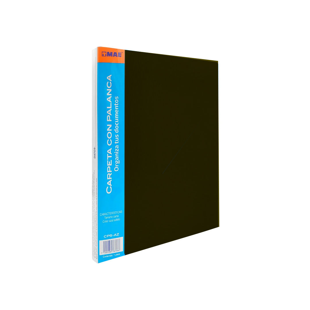 Carpeta plástica MAE tamaño carta, traslúcida y resistente, ideal para archivar documentos en oficina o escuela con rápida apertura gracias a su mecanismo metálico de palanca.