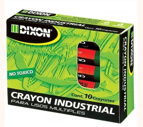Crayón base cera en forma hexagonal para usos industriales, útil en superficies lisas como piedra, madera seca, hule, cartón, papel, etc. Caja con 10 piezas color negro, no tóxico.