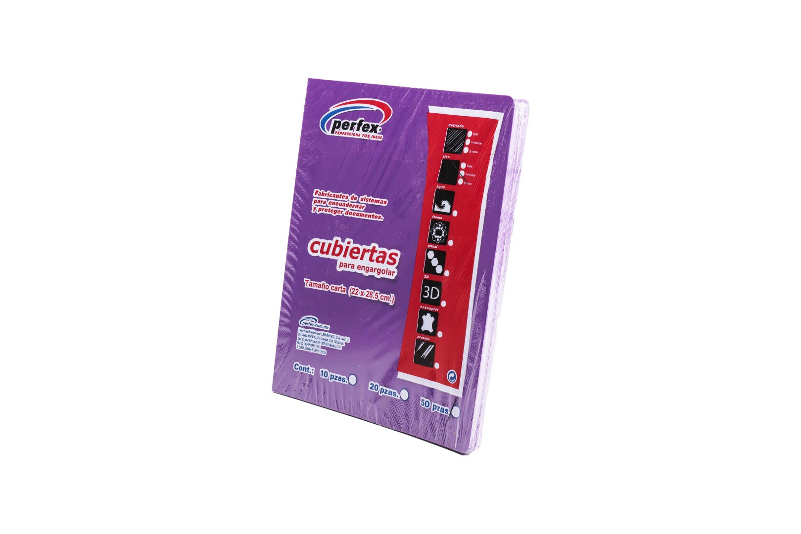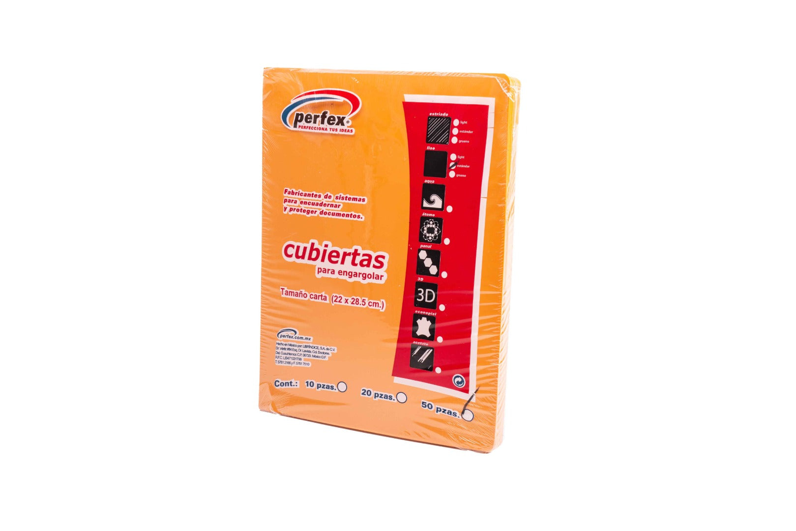 Cubiertas PERFEX de pasta lisa, perfectas para darle un toque de estilo a tus cuadernos.Características especialesContenido: 50 Cubiertas (25 juegos)Tamaño: CartaColor: Amarilla / Verde / Naranja / MoradaGrosor: 14 puntos