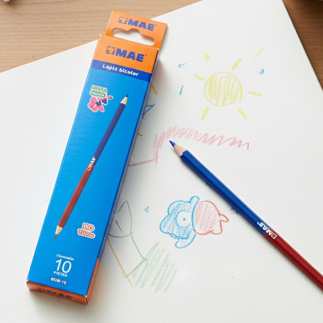 Lápiz bicolor hexagonal BEM-10 en presentación de caja con 10 piezas. Ideal para escribir, subrayar o marcar con facilidad en color rojo y azul, con diseño cómodo y resistente para uso escolar u oficina.